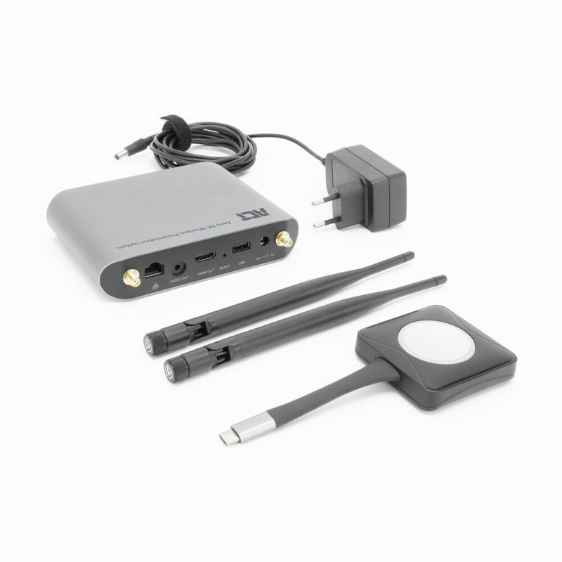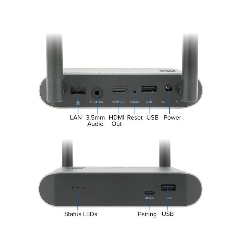 ACT Aero 4K Wireless Presentation System AC7960 je profesionalna rešitev za brezžično predstavitev vsebin med sestanki, izobraževanji ali poslovnimi dogodki. Sistem omogoča, da sHitro in enostavno delite zaslon prenosnika, tablice ali mobilne naprave na HDMI zaslon, projektor ali TV z visoko 4K resolucijo, brez zapletenih kablov ali nastavitev – povežite USB-C presenter gumb ali uporabite brezžično deljenje zaslona glede na vašo napravo.