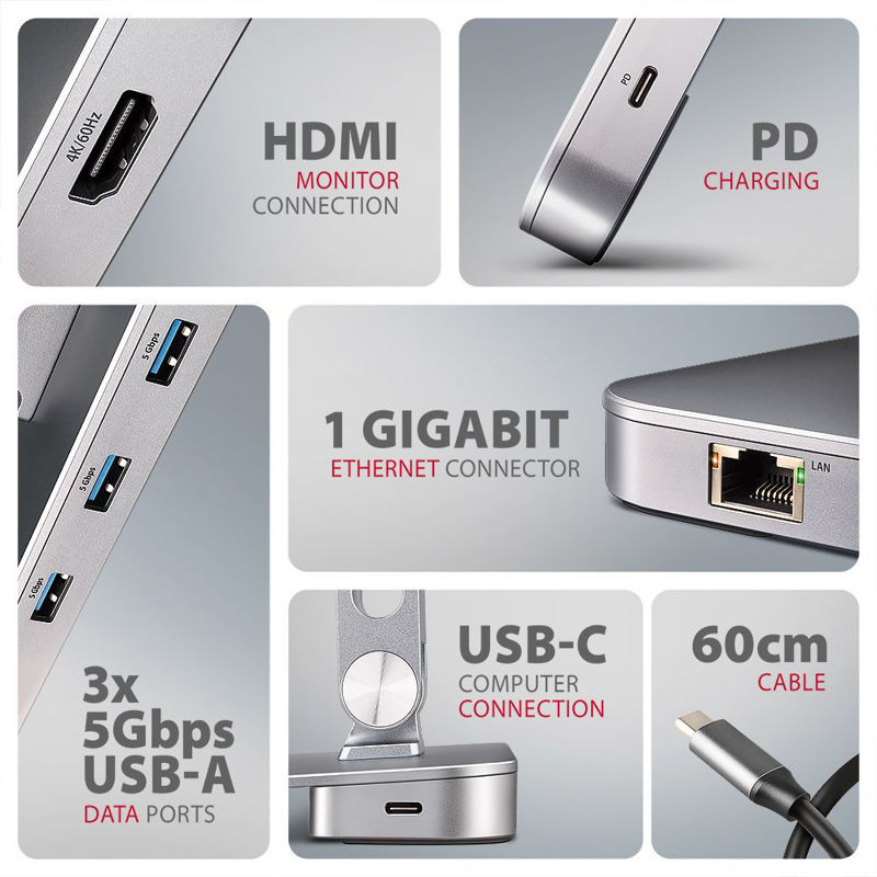 • 7-v-1 priklopna postaja: HDMI, RJ-45, PD USB-C, 3x USB-A 5 Gbps