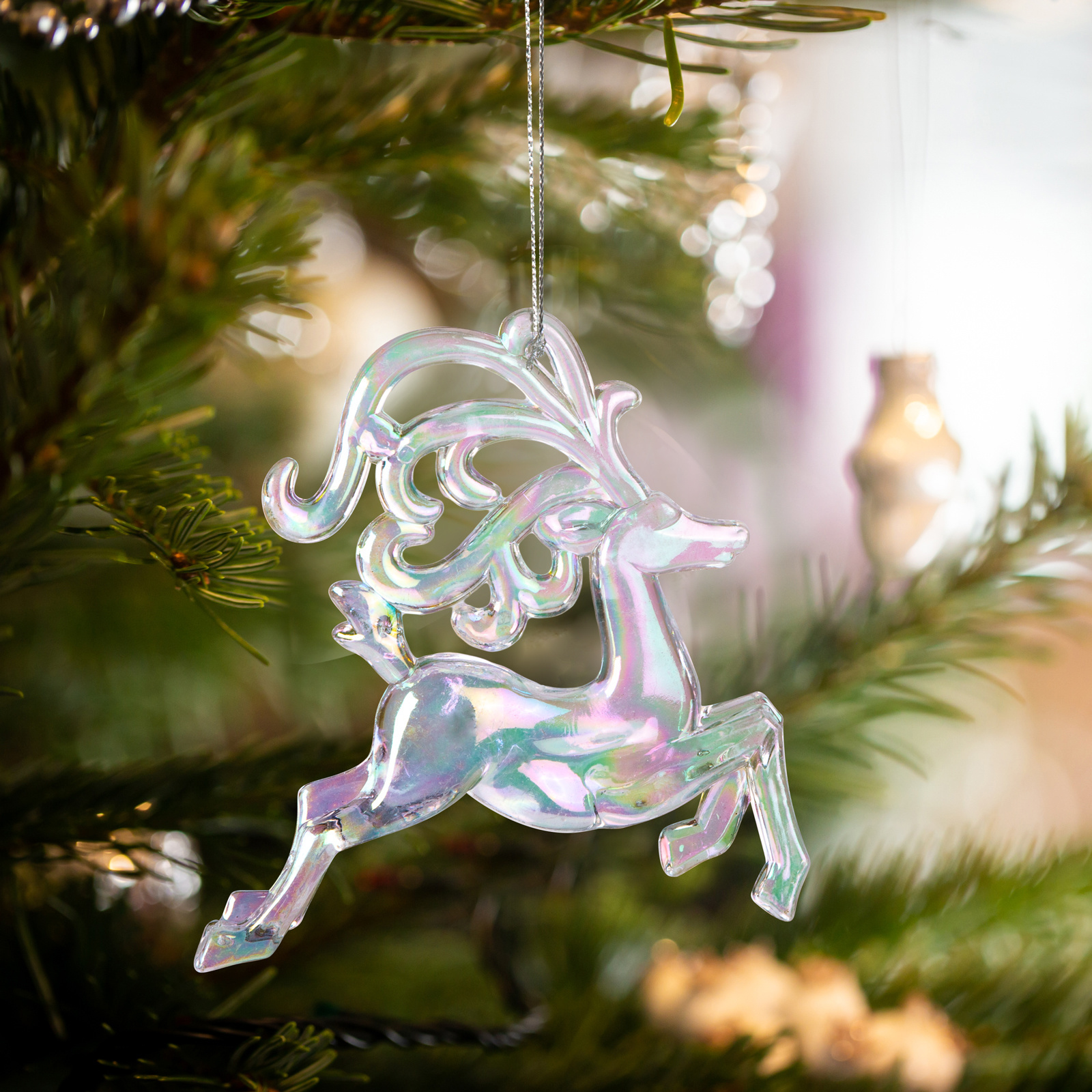 Ta božični okrasek je jelen s posebnim prelivajočim se učinkom, ki elegantno okrasi božično drevesce ali kateri koli drug praznični aranžma. Akrilni okrasek je lahek, a trpežen, zato ga je mogoče ponovno uporabiti leto za letom. Zaradi mavričnega učinka se barve okraska spreminjajo glede na sence in svetlobo, kar naredi božični okrasek še bolj čaroben. Zahvaljujoč elegantnemu videzu je lahko ta božični okrasek odlično darilo za ljubljene ali prijatelje.
