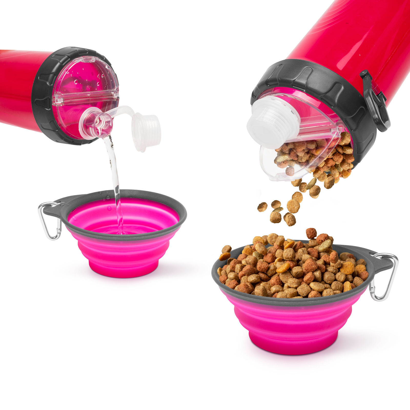 Odlična izbira na potovanju, pohodništvu, sprehajanju psov, saj je vaš ljubljenček lahko kadarkoli žejen. Preprosto potisnite dno posode in že lahko svojo pitno vodo delite s svojim psom. V kompletu je tudi barvno usklajena steklenička, s katero se lastnik lahko odžeja.