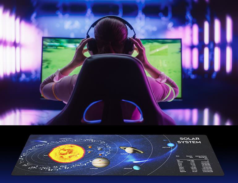 Specifikacije Tip izdelka gaming podloga za miško Velikost 350 × 900 mm Površina gladka tekstilna Spodnja stran nedrseča gumirana Združljivost optične in laserske miške Barva temna z motivom vesolja Debelina tanka in prilagodljiva