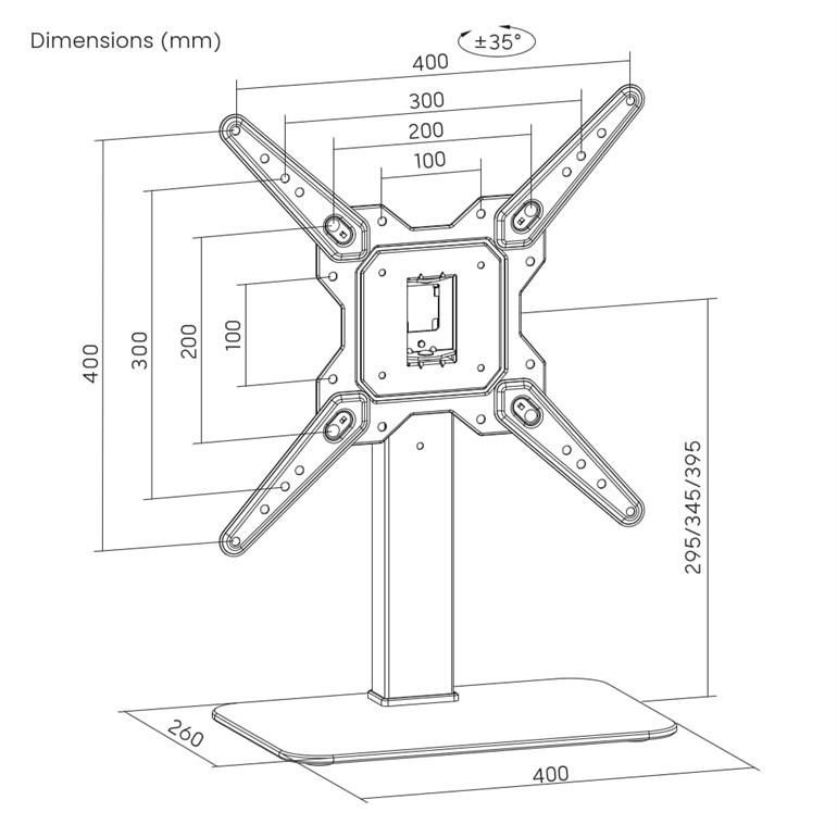 Stojalo ponuja 3-stopenjsko nastavitev višine (295 / 345 / 395 mm), kar omogoča prilagoditev višine zaslona glede na velikost televizorja ali uporabnika. Združljivo je z VESA standardi do 400x400 mm, zato ustreza večini LED in LCD televizorjev.