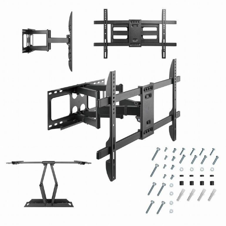 Prednosti • Podpira velike zaslone – do 80″ in 60 kg • Fleksibilna namestitev – nagib, vrtenje, nastavljiv razmik od stene • Trpežna konstrukcija iz jekla – stabilnost in dolgo življenjsko dobo • Sistem za urejanje kablov – skriti kabli, čista stena • Vse v kompletu – montažni elementi in navodila za enostavno vgradnjo