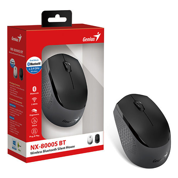 Genius NX-8000S BT je sodobna brezžična miška, ki združuje udobje, tiho delovanje in fleksibilno povezljivost. Podpira dual-mode povezavo, kar pomeni, da se lahko poveže prek Bluetooth ali prek 2.4 GHz USB nano sprejemnika. Tako jo lahko uporabljate z računalniki, prenosniki, tablicami ali telefoni ter se hitro preklapljate med do tremi napravami.