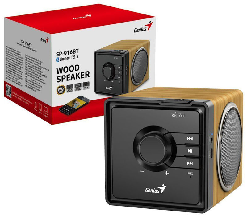 Genius SP-916BT je elegantno oblikovan prenosni Bluetooth zvočnik, ki združuje toplo in naravno akustiko borovega lesenega ohišja z zanesljivo brezžično povezavo. Moč 6 W (RMS) zagotavlja jasno in polno zvočno izkušnjo, primerno za poslušanje glasbe, podcastov ali avdio vsebin doma, v parku ali na poti. Bluetooth omogoča hitro in stabilno povezavo z vašim pametnim telefonom, tablico ali drugo napravo do razdalje več metrov, brez nepotrebnih kablov.