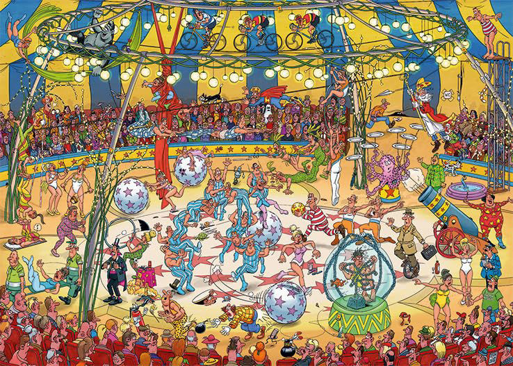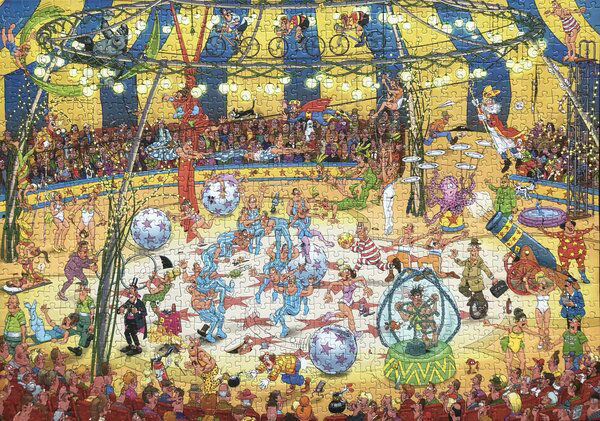 Pripravite se na kaos v cirkusu! V tej zabavni sestavljanki z naslovom Cirkus akrobatov ilustrator Jan van Haasteren prikazuje tipično norčavo dogajanje pod cirkuškim šotorom – akrobate, klovne, dresirane živali in gledalce, ki ne vedo, kam naj gledajo najprej.
