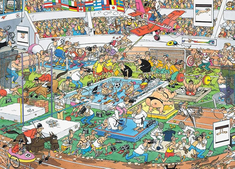 Sestavljanka Športno, športno! (“Sportive!”) vas popelje na športni dogodek, kjer nič ne poteka gladko. Namesto urejenih disciplin in tihega navijanja vas čakajo podivjani tekači, padajoče palice, žirafe na skirojih, oboževalci na progi in nepregledna množica likov v klasičnem Jan van Haasteren humorističnem slogu.