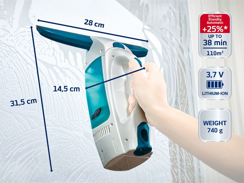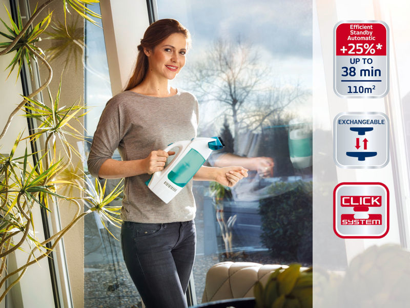 Inteligentni sistem stand-by preklopi med varčevanjem in polno močjo takoj, ko se oprema dotakne površine, kar pripomore k daljšemu času delovanja in do približno 38 min na polni bateriji, kar je dovolj za čiščenje do okoli 110 m² površin brez pavze. Odstranljiv rezervoar za odpadno vodo (100 ml) omogoča hitro praznjenje in čiščenje, dodatno pa je naprava združljiva z Leifheit Click System ročaji, kar olajša čiščenje visokih ali težko dostopnih oken brez lestve.