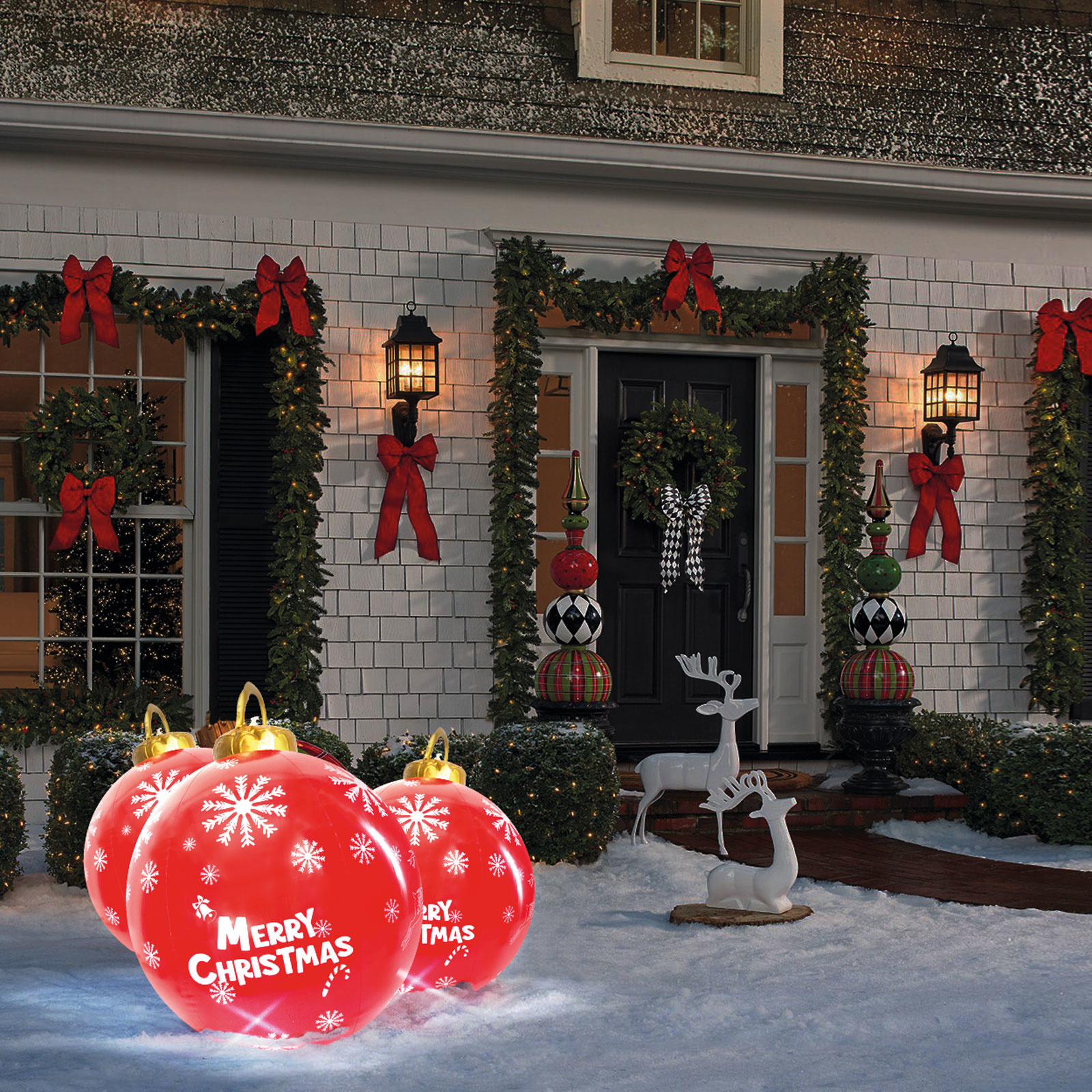 Najnovejše, inovativno okrasno orodje za božično obdobje je napihljiva, osvetljena okrasna krogla. Zaradi velike velikosti ga lahko postavite tudi v večje vrtove, obesite na drevo ali celo dobro izgleda na vodni površini bazena. LED enota, ki jo lahko namestite na dno okrasne krogle, osvetli notranjost krogle s čudovito svetlobo. LED diode napajajo 2 x CR2450 baterije. S priloženim daljinskim upravljalnikom lahko nastavite želeni način osvetlitve.