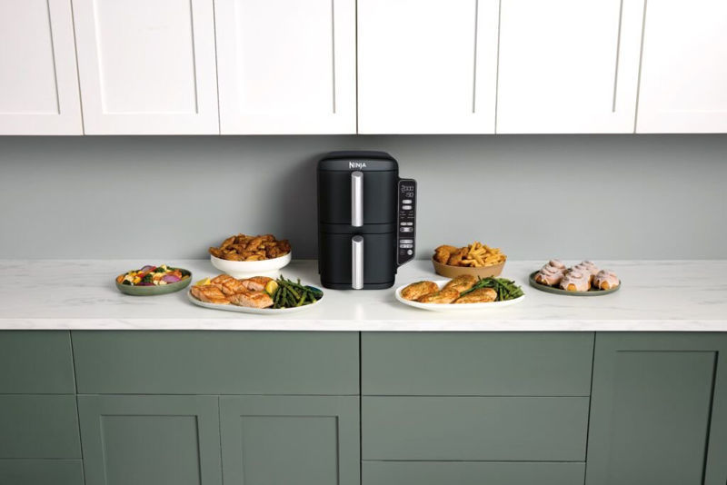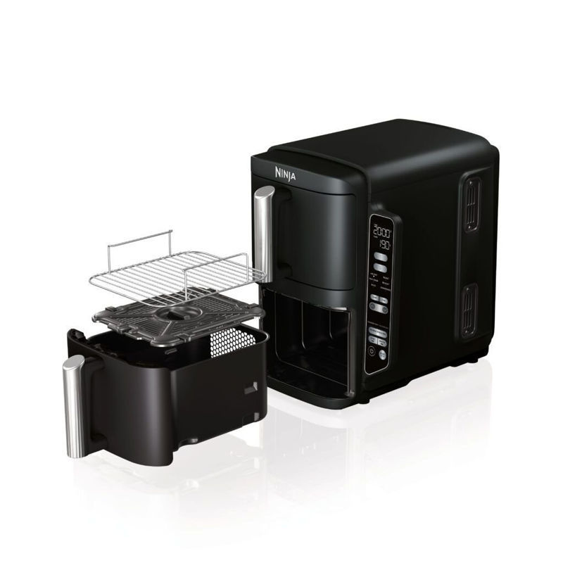 Ninja SL300EU Double Stack je napreden dvojni air fryer (cvrtnica na vroč zrak) z inovativno zasnovo dveh zloženih predalov, ki prihrani prostor na kuhinjskem pultu, hkrati pa ohranja veliko kapaciteto.