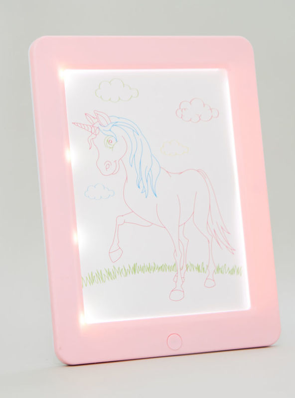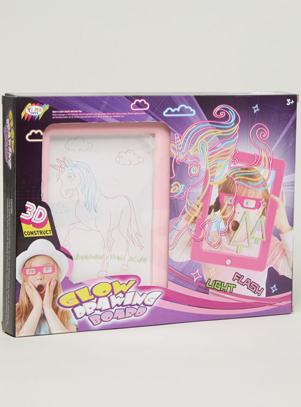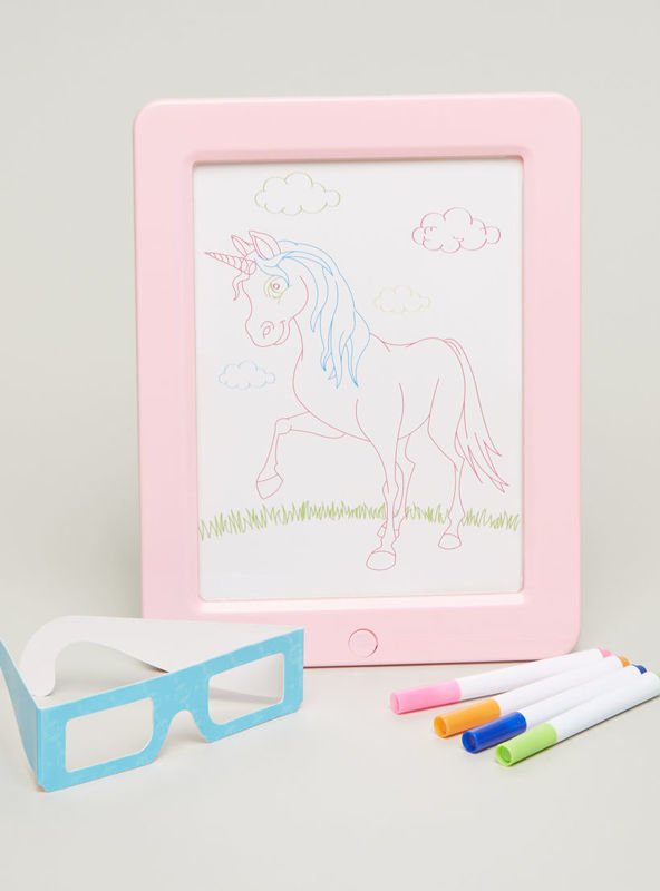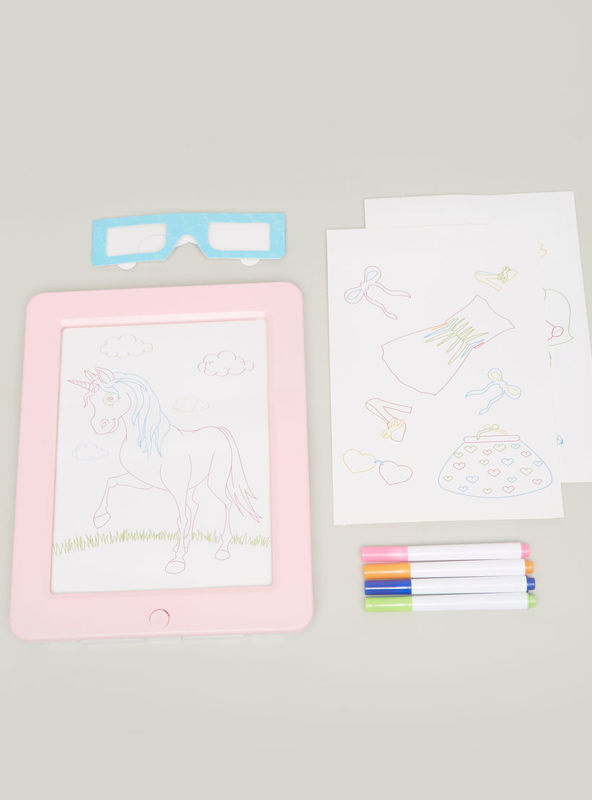 Risalna tabla z vgrajeno LED svetilko je popoln ustvarjalni komplet za otroke, ki si želijo risati na zabaven in inovativen način. Fluorescentna površina omogoča risanje s priloženimi markerji, pri čemer risbe svetijo v temi. Priložene predloge s tematiko dinozavrov bodo navdušile male ustvarjalce, očala pa dodatno popestrijo izkušnjo. Uporabna tudi kot dekorativen element v otroški sobi!