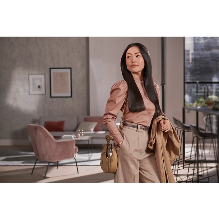 Philips 5000 Series BHS530/00 je sodoben stilistični pripomoček za ustvarjanje ravnih pričesk, mehkih valov ali kodrov — hitro in nežno. Napredna tehnologija ThermoShield samodejno uravnava toploto od korenine do konic, s čimer zmanjša tveganje za poškodbe las. Keramične plošče z infuzijo arganovega olja nežno drsijo skozi lase in omogočajo gladko, učinkovito oblikovanje, medtem ko sistem dvojne ionske nege (2× Ionic Care) preprečuje statično nabiranje las in jim povrne sijaj in gladkost. Temperaturo lahko sami prilagodite med 120 °C in 230 °C, pri čemer daljši 105 mm plošči omogočata dobro prevlečeno stikalo z lasmi, kar pospeši in olajša oblikovanje. Z eno napravo lahko naredite vse – od ravnih las do kodrov – z dolgotrajnim rezultatom in manj poškodbami.