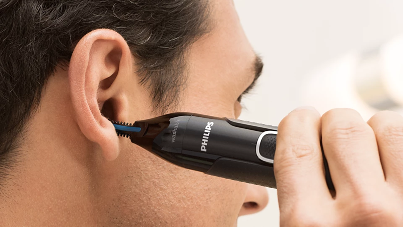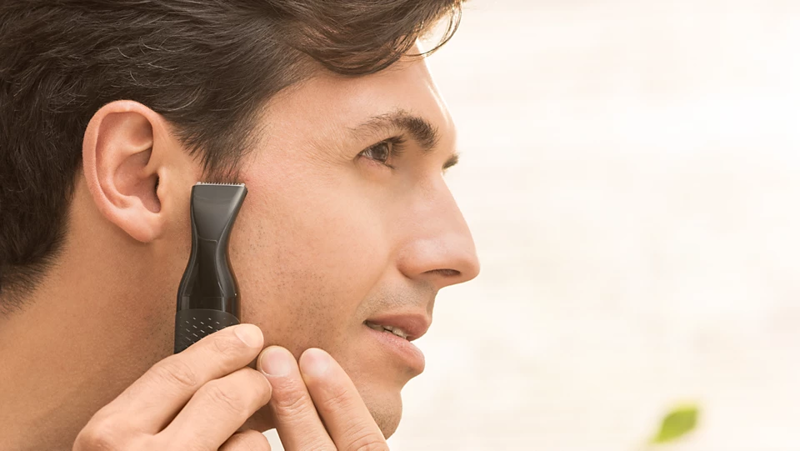 Natančno prirezovanje dlačic v nosu, ušesih, obrvah in obrazu — brez bolečega vlečenja.