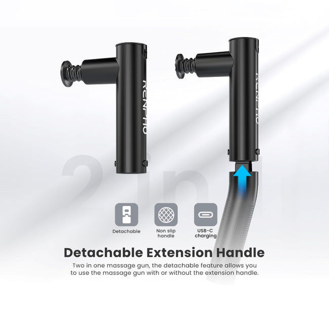 RENPHO Extend Handled Cordless Massager – Black je zmogljiva perkusijska masažna pištola z ergonomskim odstranljivim ročajem, ki omogoča enostaven dostop do hrbta, ramen, vratu in drugih težje dosegljivih predelov. Zahvaljujoč brezžični zasnovi in nastavljivim intenzivnostim se masaža prilega vašim potrebam – od rahlega sproščanja napetosti do globinskega masažnega učinka za lajšanje bolečin in izboljšanje regeneracije mišic po naporu.