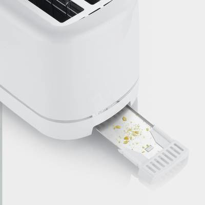 Preprosto upravljanje vključuje funkcije Cancel/Stop (prekini praženje), Reheat (ponovno ogrevanje) in Defrost (odtaljevanje zamrznjenega kruha), kar poveča vsestranskost uporabe. Snemljiv zbiralnik drobtin omogoča hitro in enostavno čiščenje, elegantna kombinacija nerjavečega jekla in kakovostne plastike pa daje tosterju modern videz, ki se prilega vsaki kuhinji.