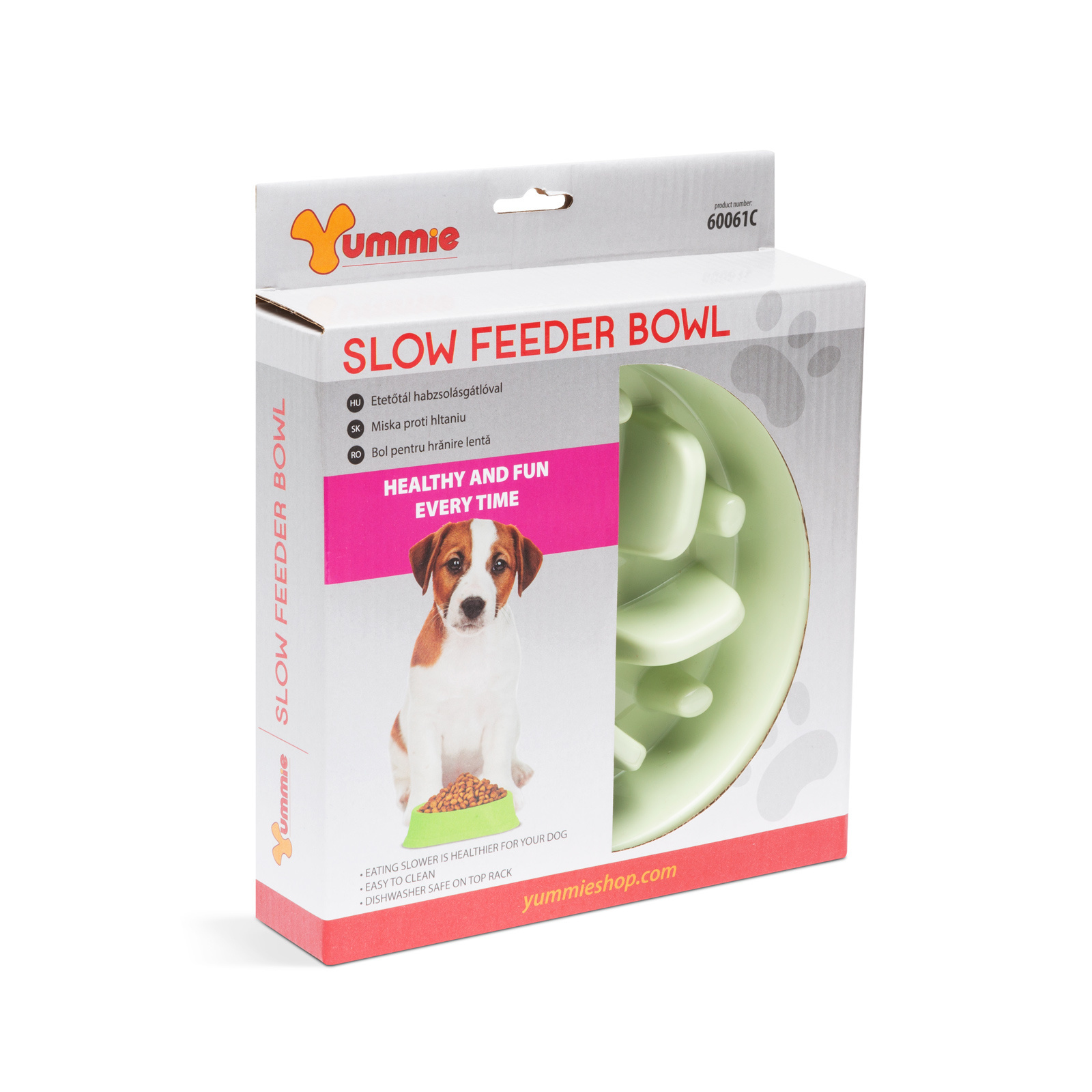 Posebno oblikovana plastična posodica za hranjenje, ki vašemu ljubljenčku preprečuje, da bi prehitro pojedel hrano. Zaradi izboklin na dnu posode kuža ne more hitro jesti in se tako izogne morebitnim prebavnim težavam in napenjanju. Pes lahko v igrivi obliki le po malem jemlje hrano iz različnih višin posode, s čimer upočasni in prepreči prekomerno dnevno uživanje hrane.