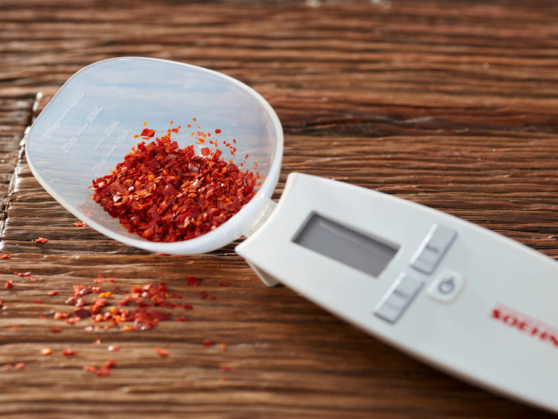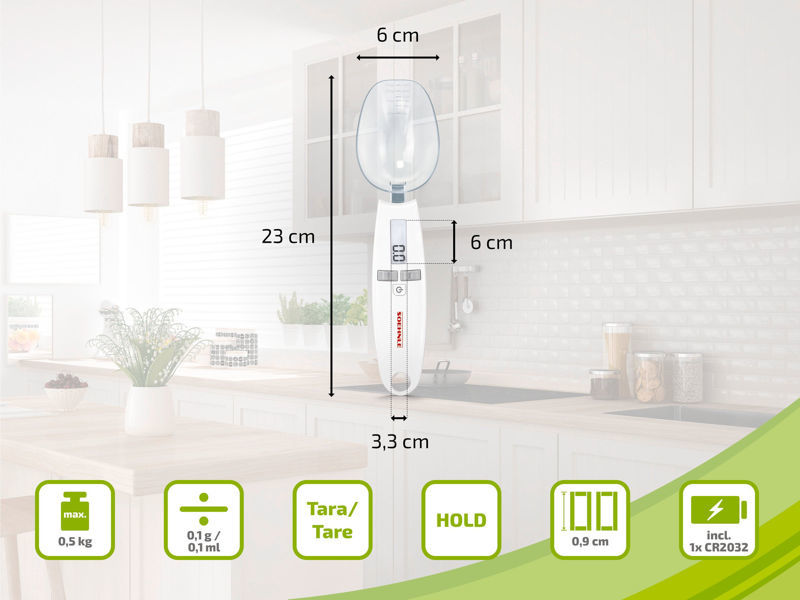 Kompaktna zasnova v obliki žlice — tehtanje neposredno iz posode, brez dodatnih merilnih pripomočkov