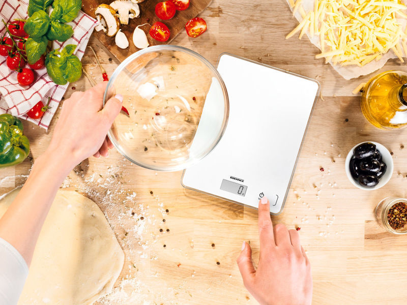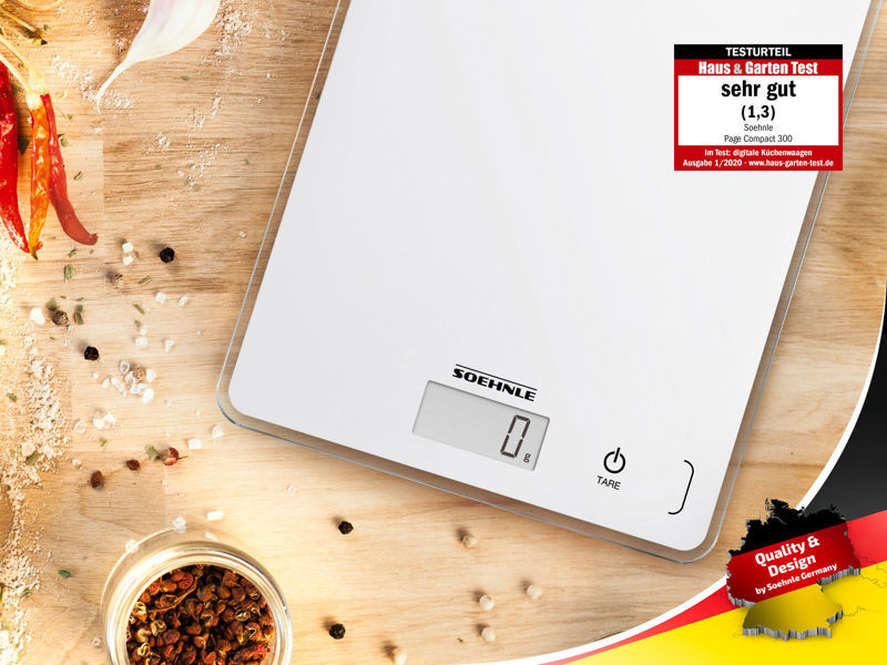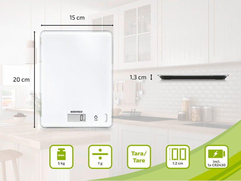 Soehnle Page Compact 300 omogoča hitro in natančno tehtanje sestavin za kuho in peko. Z največjo kapaciteto 5 kg in natančnostjo 1 g je primerna tako za manjše količine začimb kot tudi za večje količine sestavin. Hvala priročni funkciji “tara” lahko v eni posodi zaporedoma tehtate več sestavin brez dodatnega prelaganja. Sensor-touch nadzor in steklena površina pomenita enostavno čiščenje — tehtnica je po uporabi hitro pripravljena za naslednjo uporabo. Zaradi kompaktne in ultra-tank zasnove je shranjevanje enostavno: zavzame malo prostora in jo lahko tudi obesite na steno. Proti-drsne nogice zagotavljajo stabilnost na kuhinjskem pultu. LCD zaslon z velikimi številkami omogoča enostavno odčitavanje rezultatov.