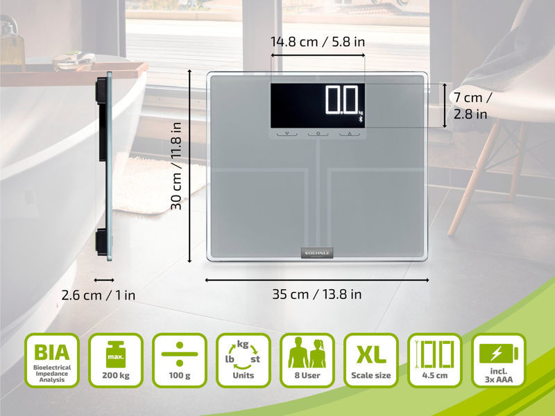 Soehnle Shape Sense Connect 200 je inteligentna osebna tehtnica, ki presega klasično tehtanje telesne mase. Z vgrajeno Bio-Impedance Analysis (BIA) tehnologijo natančno izmeri telesno maščobo, delež vode, mišično maso in indeks telesne mase (BMI), kar vam omogoča bolj poglobljen vpogled v vaše telesno stanje. Bluetooth povezava omogoča brezžično sinhronizacijo z mobilno aplikacijo Soehnle MyScale, kjer lahko spremljate rezultate, analizirate trende in postavljate cilje. Aplikacija omogoča shranjevanje podatkov številnih uporabnikov, zato je tehtnica primerna za družinsko rabo.
