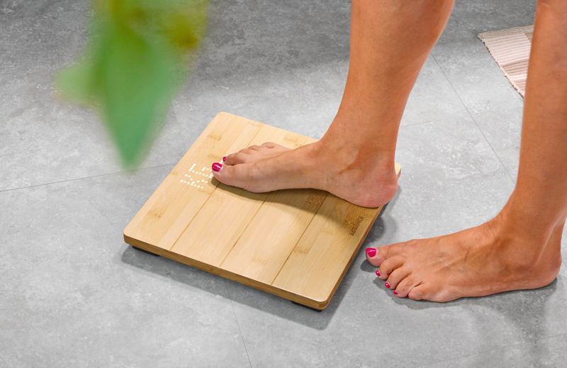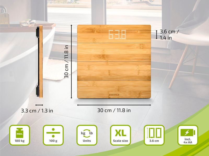 Specifikacije: Maksimalna nosilnost: 180 kg Natančnost: 100 g Prikaz: velik LCD zaslon Material površine: bambus Funkcije: samodejni vklop/izklop, stabilna konstrukcija Napajanje: baterije (vključene) Uporaba: osebno tehtanje telesne teže vsak dan