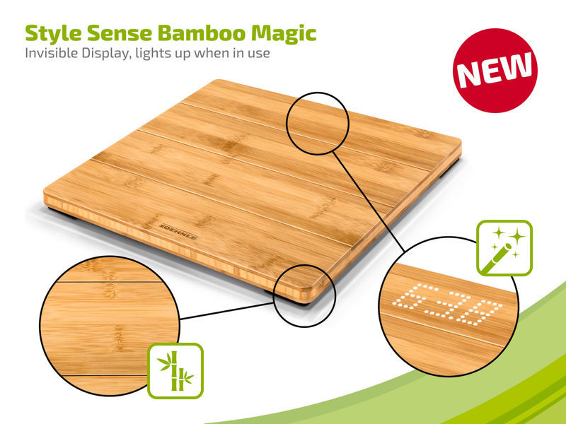 Soehnle Style Sense Bamboo Magic je moderna in funkcionalna osebna tehtnica, ki združuje zanesljivo merjenje telesne teže z estetsko naravno površino iz bambusa. Tehtnica omogoča natančno merjenje telesne teže do 180 kg z delitvijo 100 g in ima velik LCD zaslon, ki omogoča enostavno odčitavanje. Zaradi materiali iz pravega bambusa in stabilne konstrukcije je tehtnica ne le praktična, ampak tudi dekorativni element v kopalnici ali spalnici. Samodejni vklop ob stopitvi nanjo in samodejni izklop po uporabi skrbita za varčevanje z energijo, nedrseče nogice pa zagotavljajo varno uporabo. Style Sense Bamboo Magic je odlična izbira za vse, ki želijo spremljati svojo telesno težo in si želijo estetsko privlačen dodatek v prostoru.